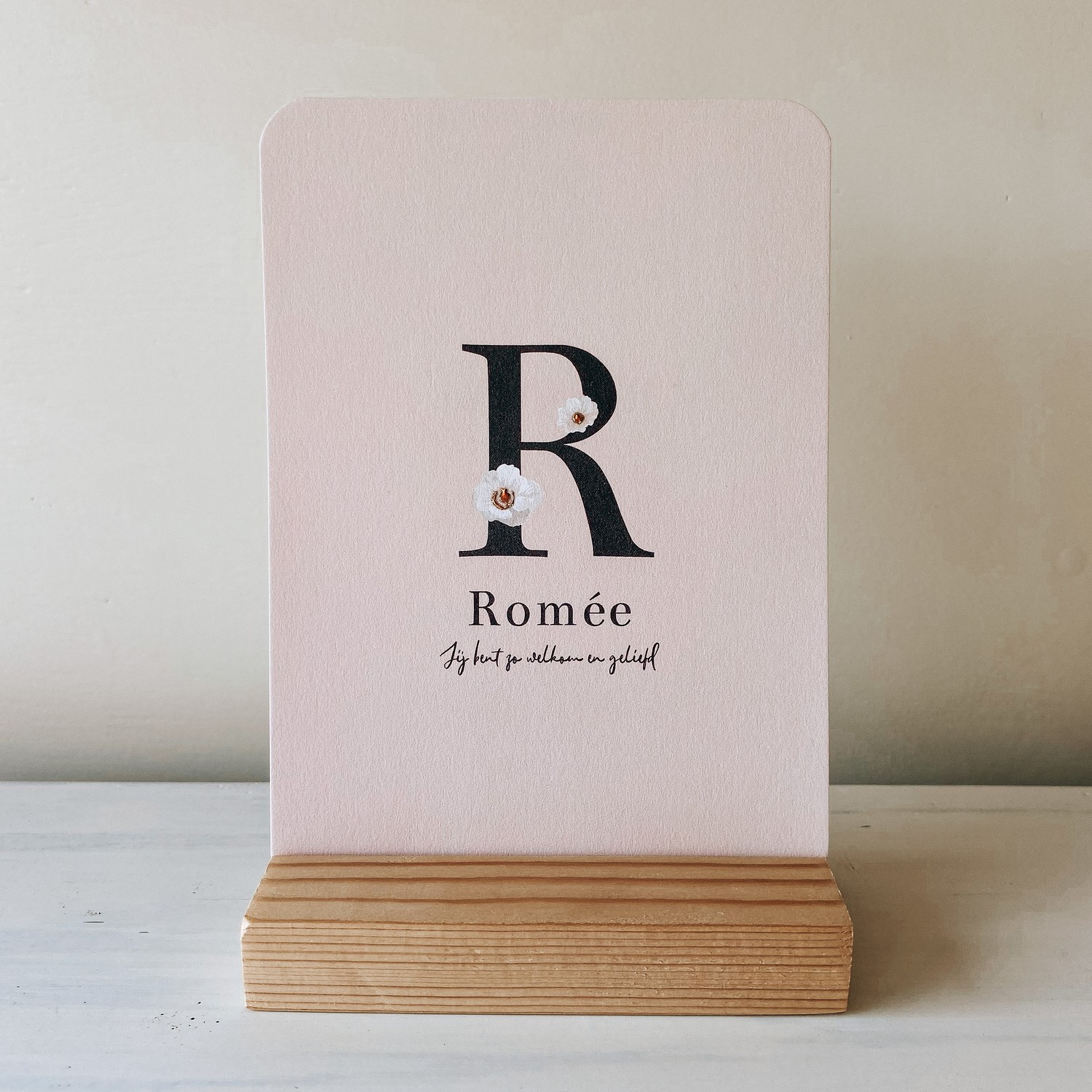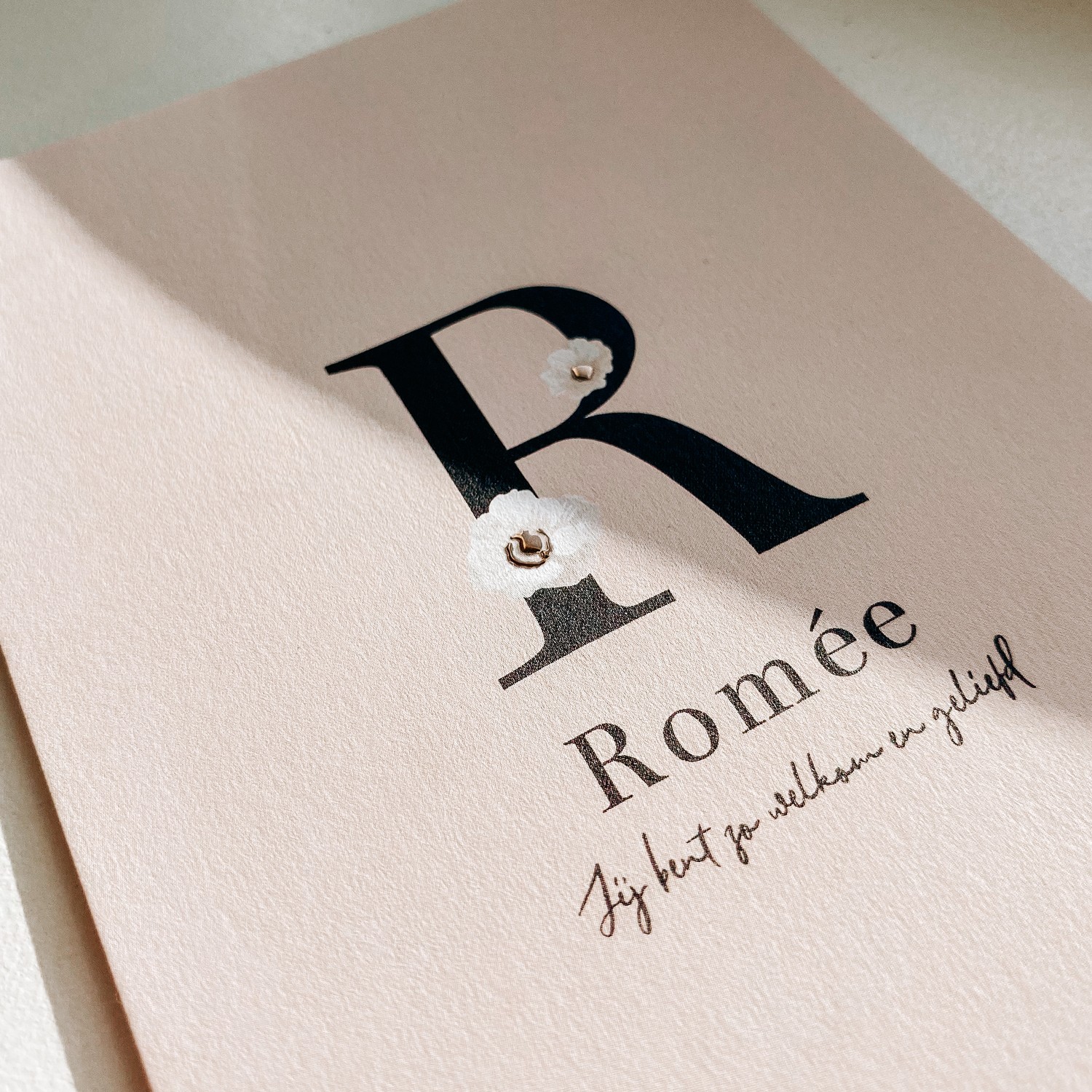 De rosé‑gouden hartjes in de bloemen waren een bewuste keuze: een subtiel accent dat het kaartje een vleugje luxe en zachtheid geeft zonder te overheersen. Uiteindelijk koos ik voor Houtvrij Offset papier, omdat de matte structuur perfect aansluit bij de natuurlijke, zachte uitstraling van het ontwerp. De rosé‑gouden details komen hierdoor mooi naar voren, terwijl het geheel rustig en verfijnd blijft.