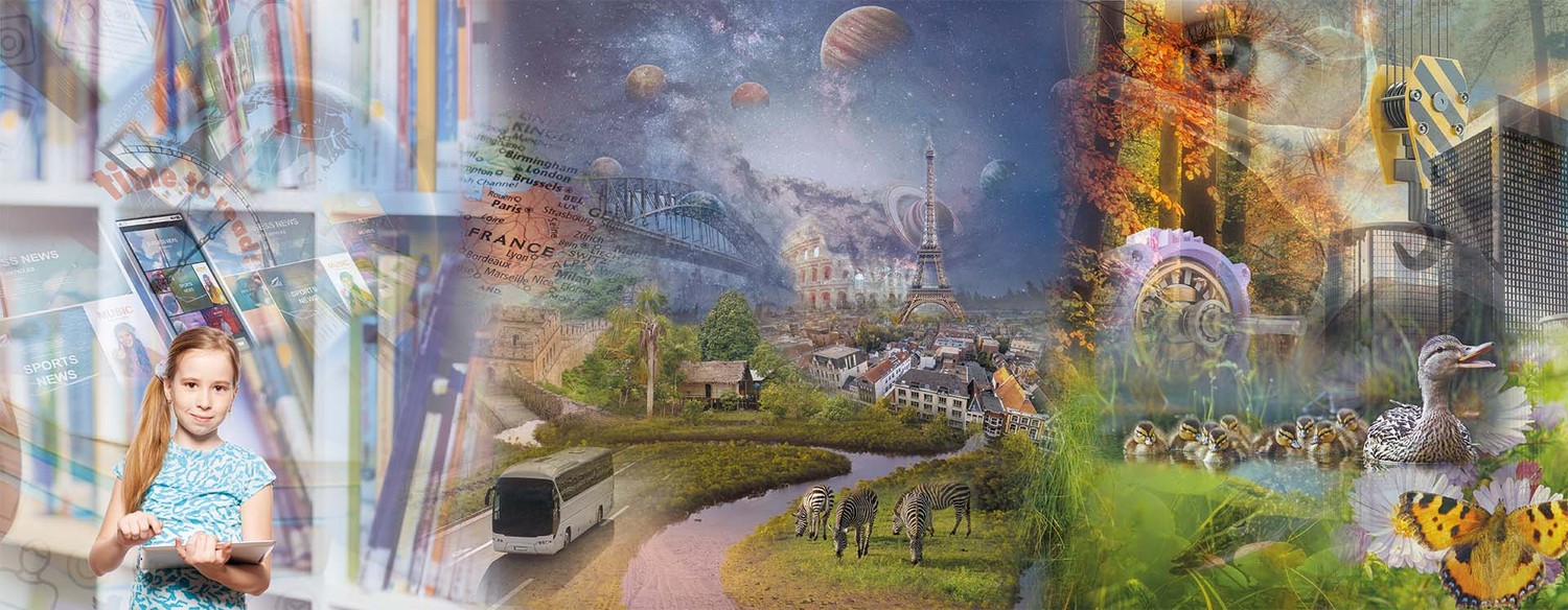 Voor dit bedrijfsbehang wilde ik een inspirerende wand creëren die volledig draait om beeld. Herkenbare afbeeldingen die de sfeer en inhoud van drie schoolmethoden tot leven brengen: taal, aardrijkskunde en biologie (natuur en techniek).