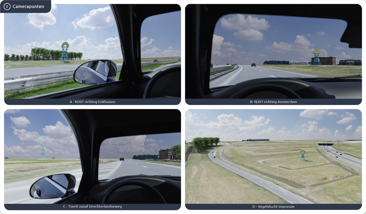 Het was mijn rol om een 3D-model te maken en een visualisatie van het aanzicht vanaf de weg te leveren, zodat de optimale positionering van het kunstwerk kan worden bepaald.