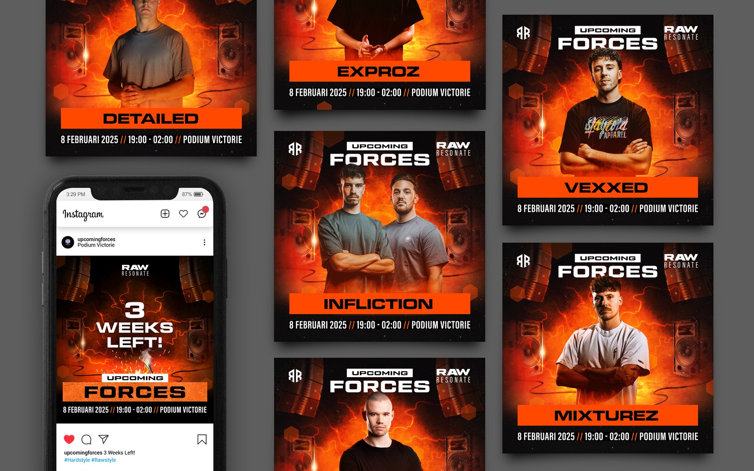 Het concept draait om full power en maximale energie. De muziek is hard, snel en intens — tot het punt waarop de speakers het bijna begeven. Deze fysieke beleving van geluid en kracht is vertaald naar het visuele thema. Ik heb gekozen voor warme, vurige kleuren, ruwe texturen en een industriële sfeer die past bij de rauwheid van de muziek en de mentaliteit van de artiesten.